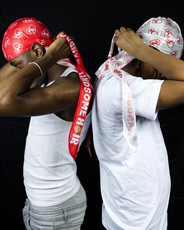 "Show your love with our red & white Valentine’s Day durag, featuring an all-over heart-shaped Handsome Hair logo for a unique and stylish touch! This satin durag not only protects your hair but also adds a pop of love to your look. Perfect for celebrating the season in style! 💘 #HandsomeHair #ValentinesDayVibes"